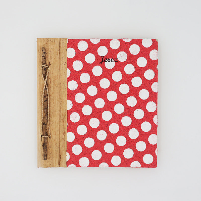Álbum de fotos para conservar sus recuerdos de la visita a Jerez en imágenes. Decorado con lunares y rama de madera en la pasta, es una concepción artesana 100%