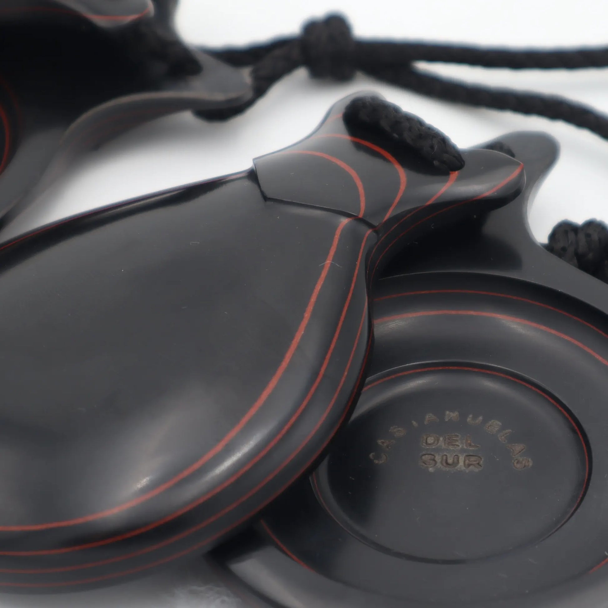 Las castañuelas profesionales de fibra se realizan de manera artesanal con láminas de papel prensadas, bañadas en resina y grabadas con el emblema de nuestra marca: CASTAÑUELAS DEL SUR.