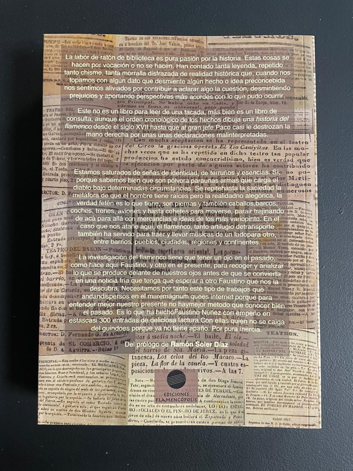 Este libro contiene las más de trecientas entradas relacionadas con los orígenes del flamenco que durante cinco años se publicaron en el blog El Afinador de Noticias, rastreadas por Faustino Núñez entre los años 2002 y 2015 en las hemerotecas gaditanas y las digitales. Las entradas se han ordenado de forma cronológica y en ellas el lector encontrará respuesta a muchas cuestiones acerca de los procesos que dieron lugar al flamenco, aclarando aspectos importantes sobre cómo, mediado el siglo XIX, empezaron a cristalizar los estilos, atendiendo además a quiénes fueron los principales protagonistas del milagro que dio lugar a un género musical único en el mundo de la música y el baile.