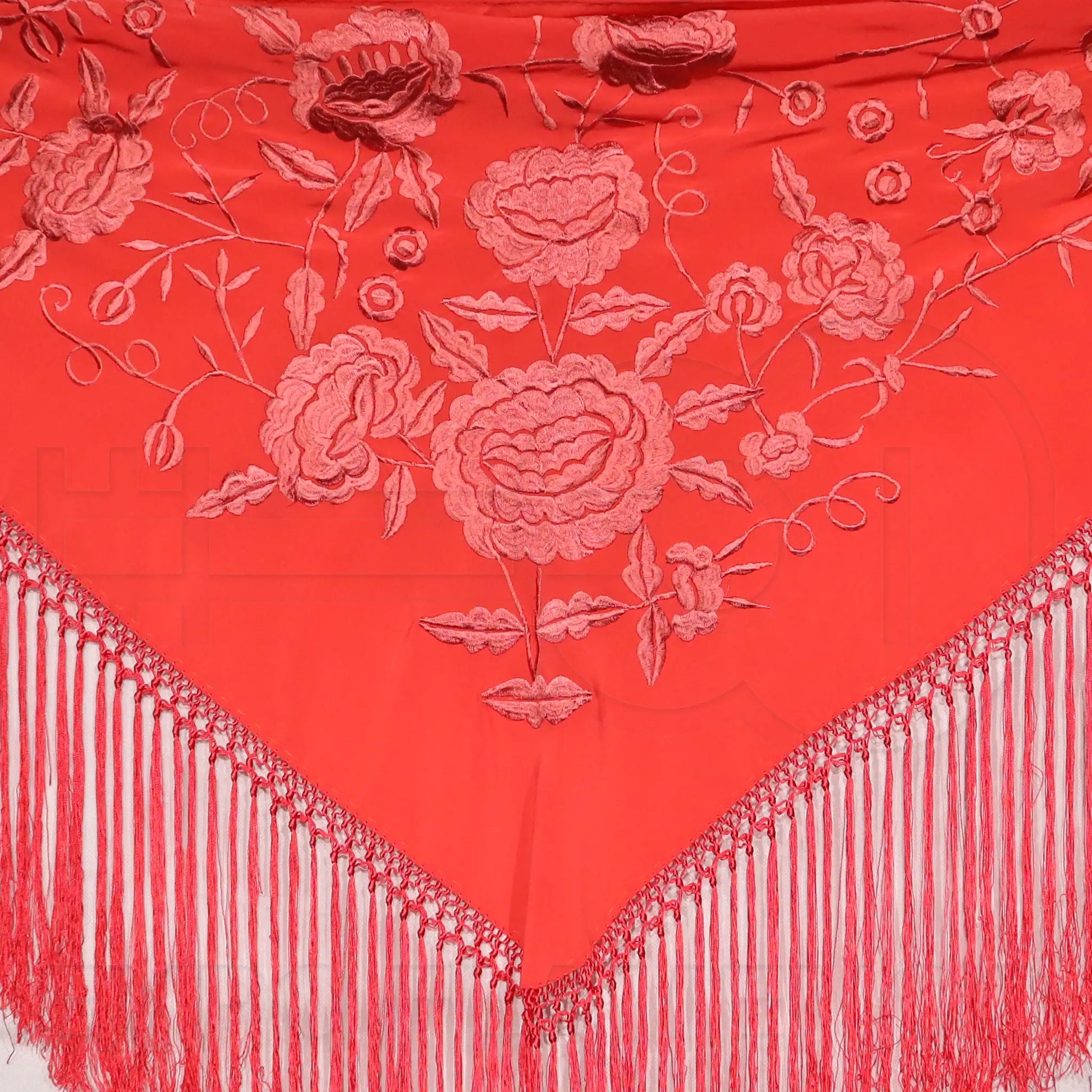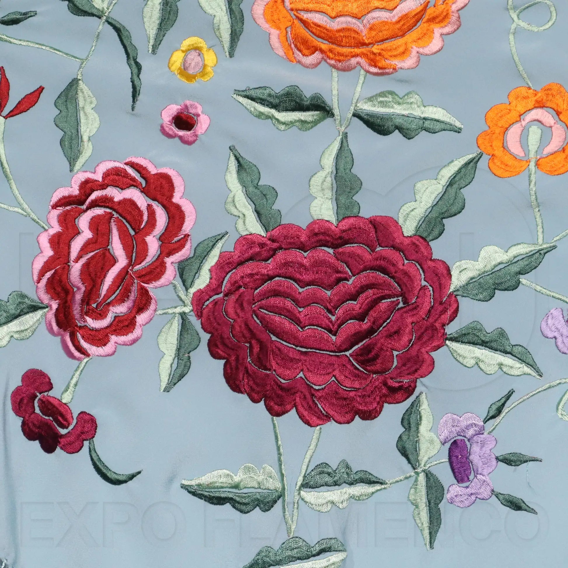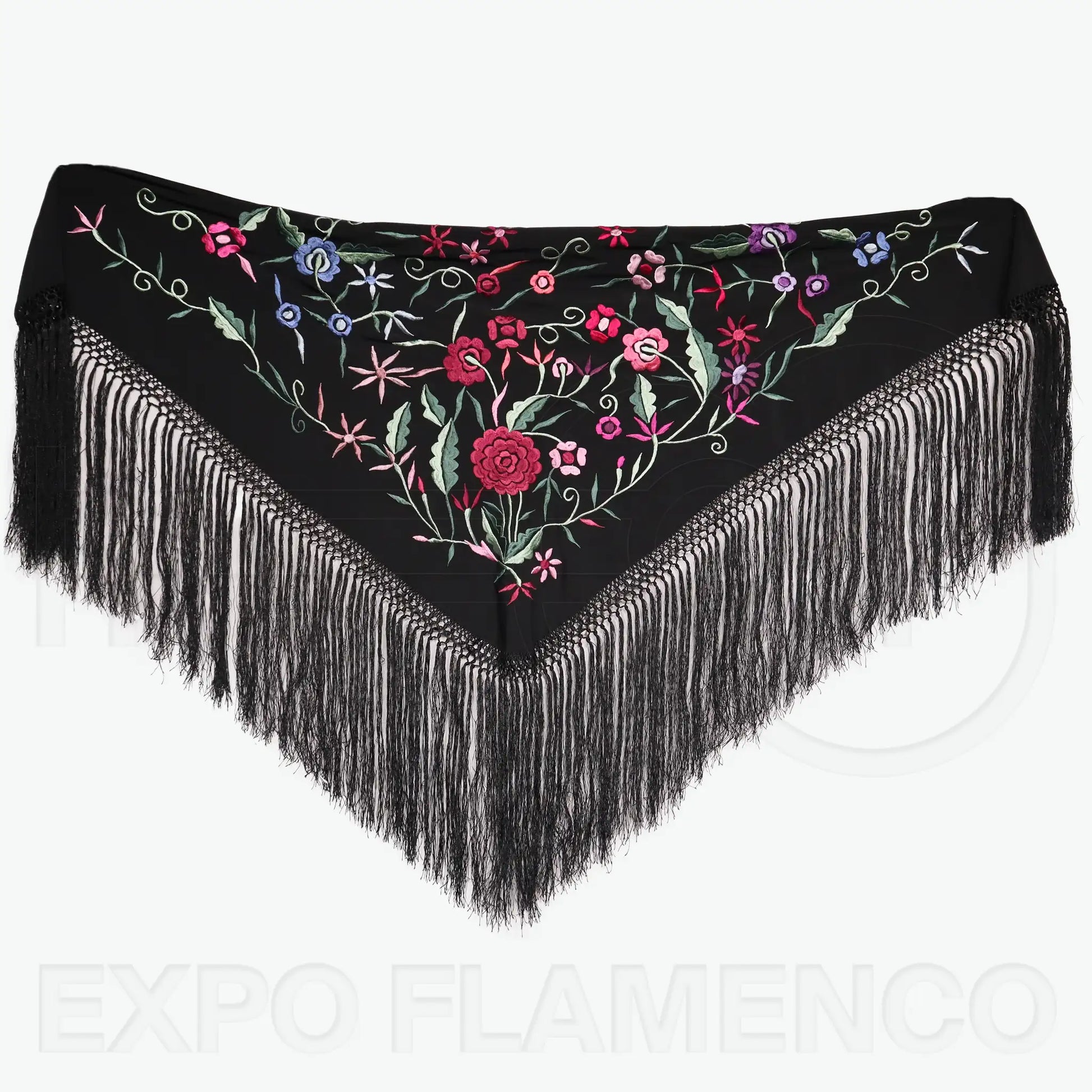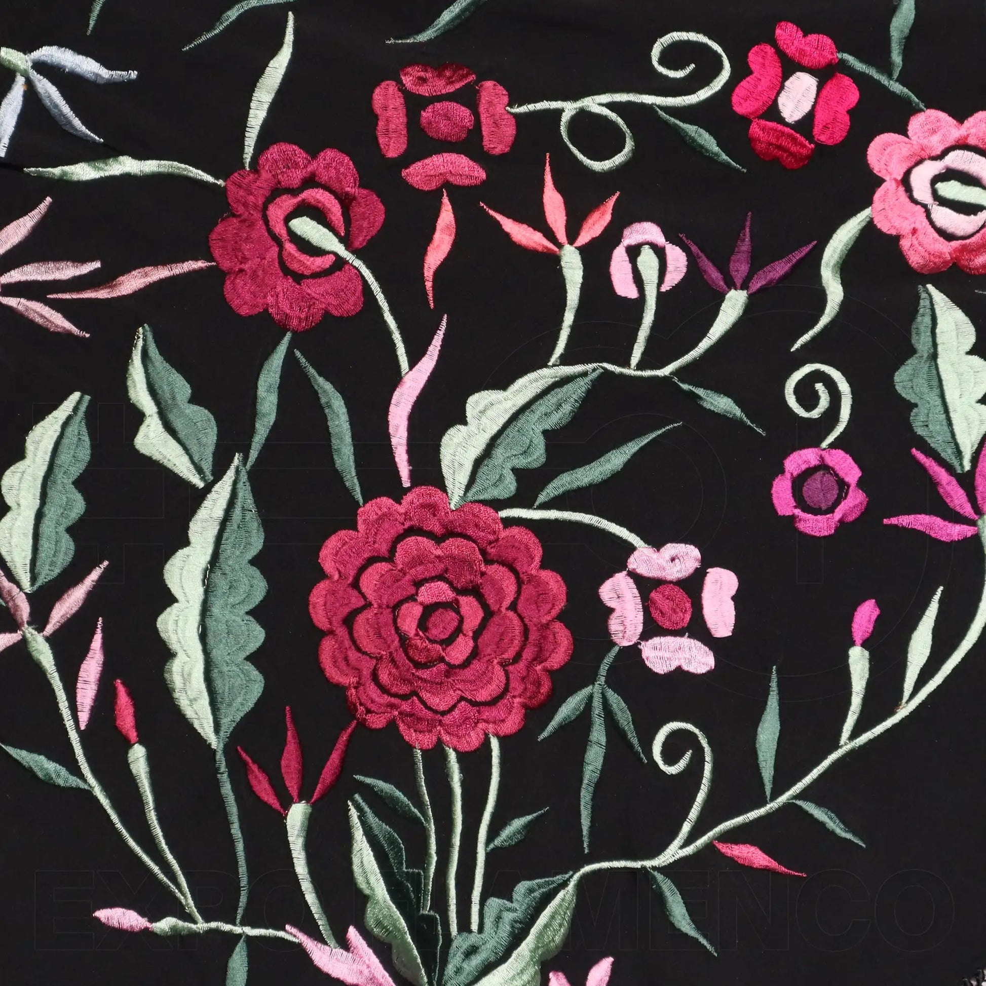 Este mantoncillo de crespón de seda en varios colores, con un aristocrático bordado en seda, es una prenda de artesanía española creada a mano con maestría. Un enrejado con minuciosidad manual preside esta obra de arte, cuyas medidas son: 130 cm de largo, 64 cm de ancho máximo y 26 cm de enrejado más fleco.