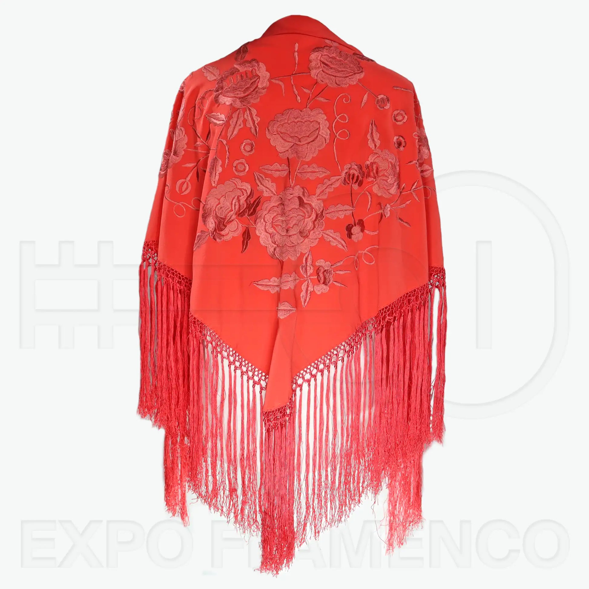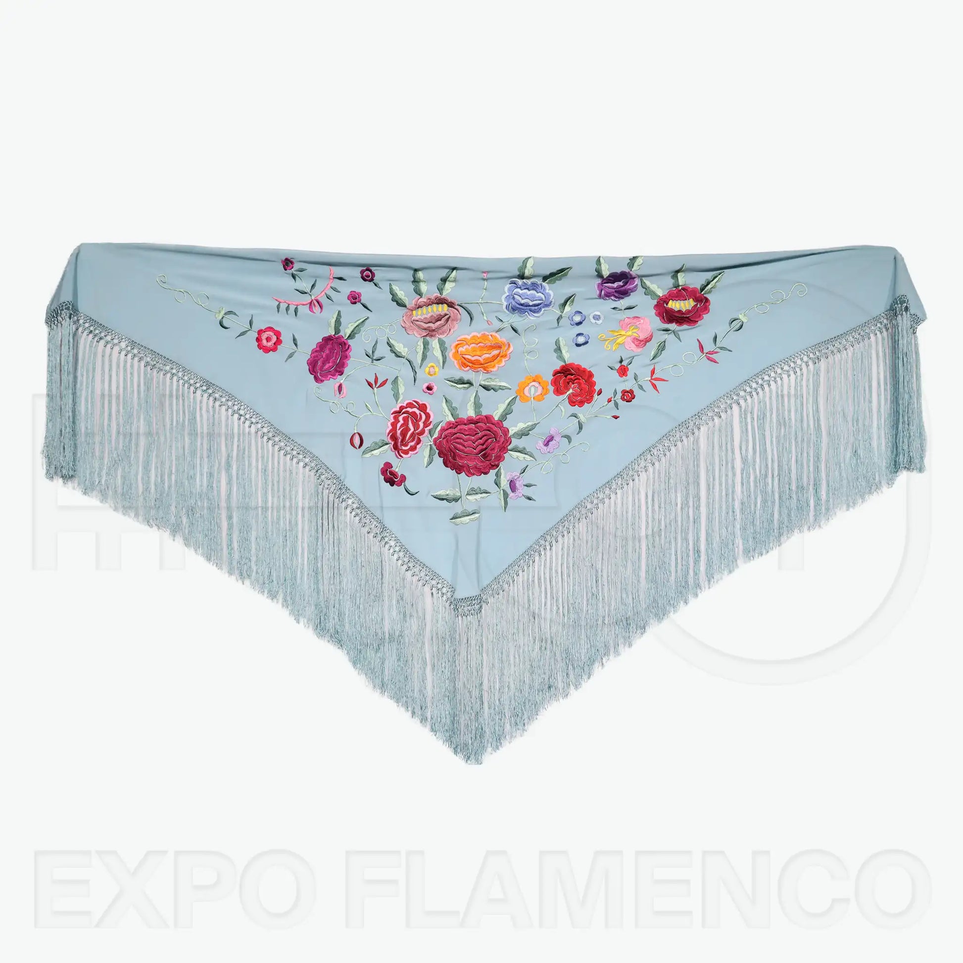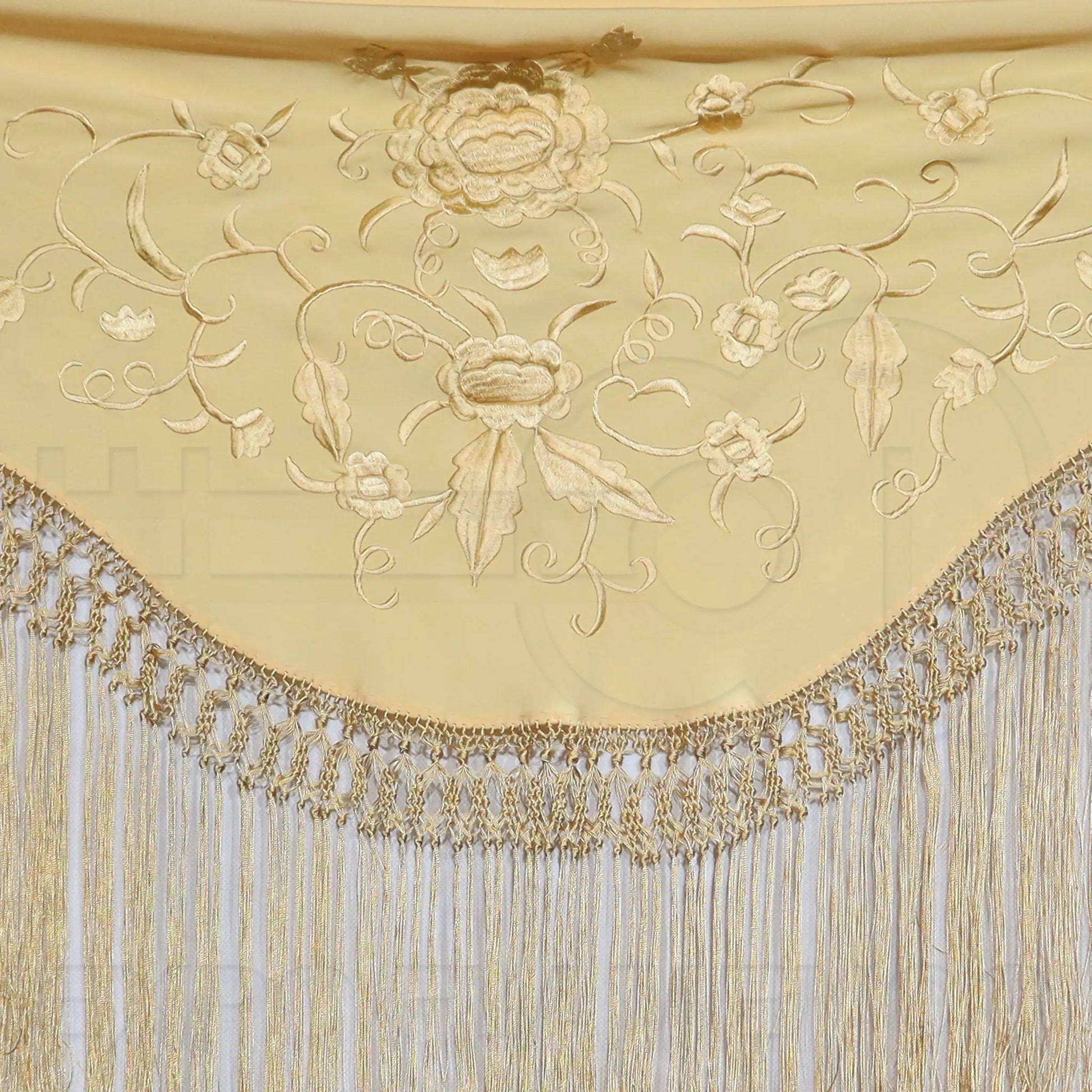 Este mantoncillo de crespón de seda en varios colores, con un aristocrático bordado en seda, es una prenda de artesanía española creada a mano con maestría. Un enrejado con minuciosidad manual preside esta obra de arte, cuyas medidas son: 130 cm de largo, 64 cm de ancho máximo y 26 cm de enrejado más fleco.