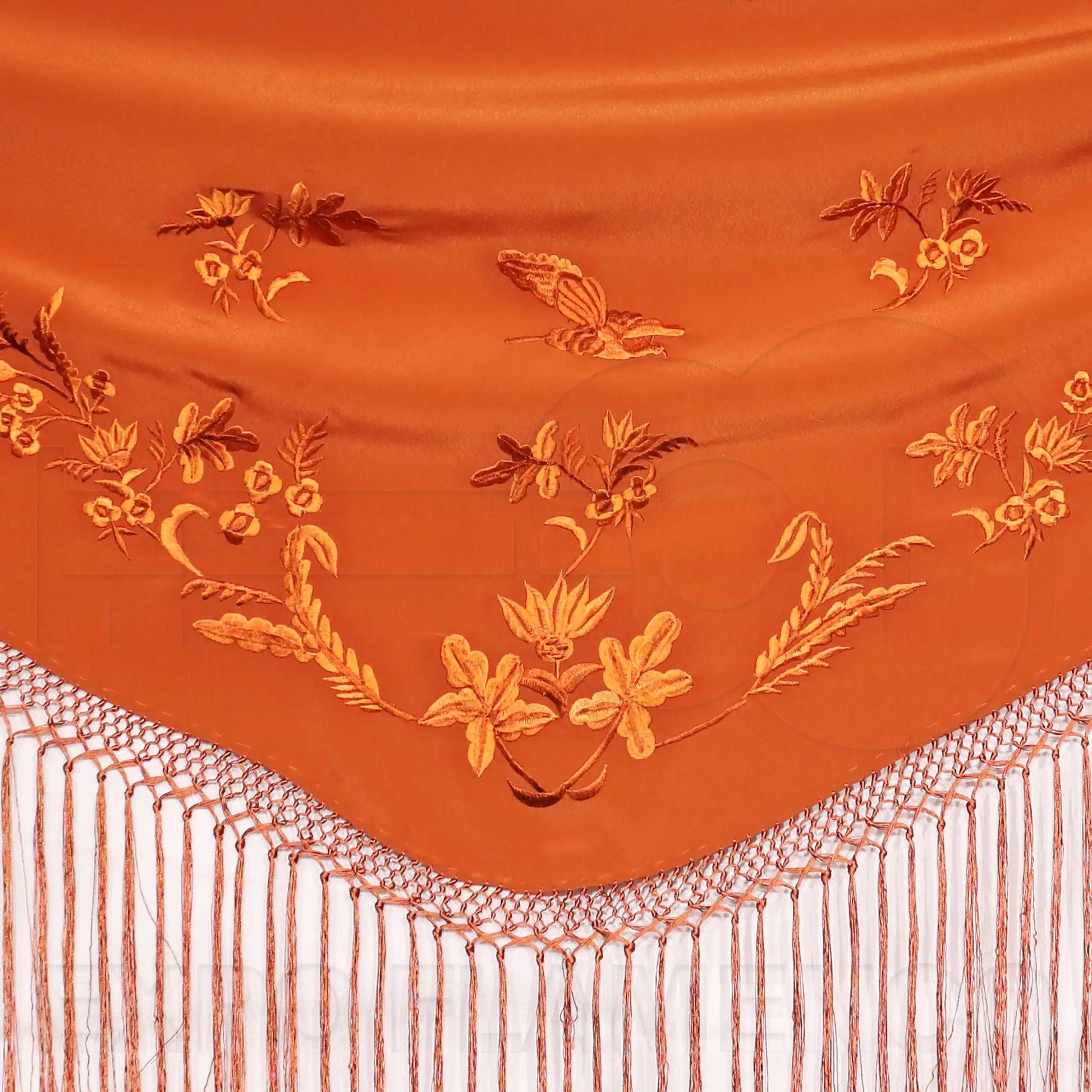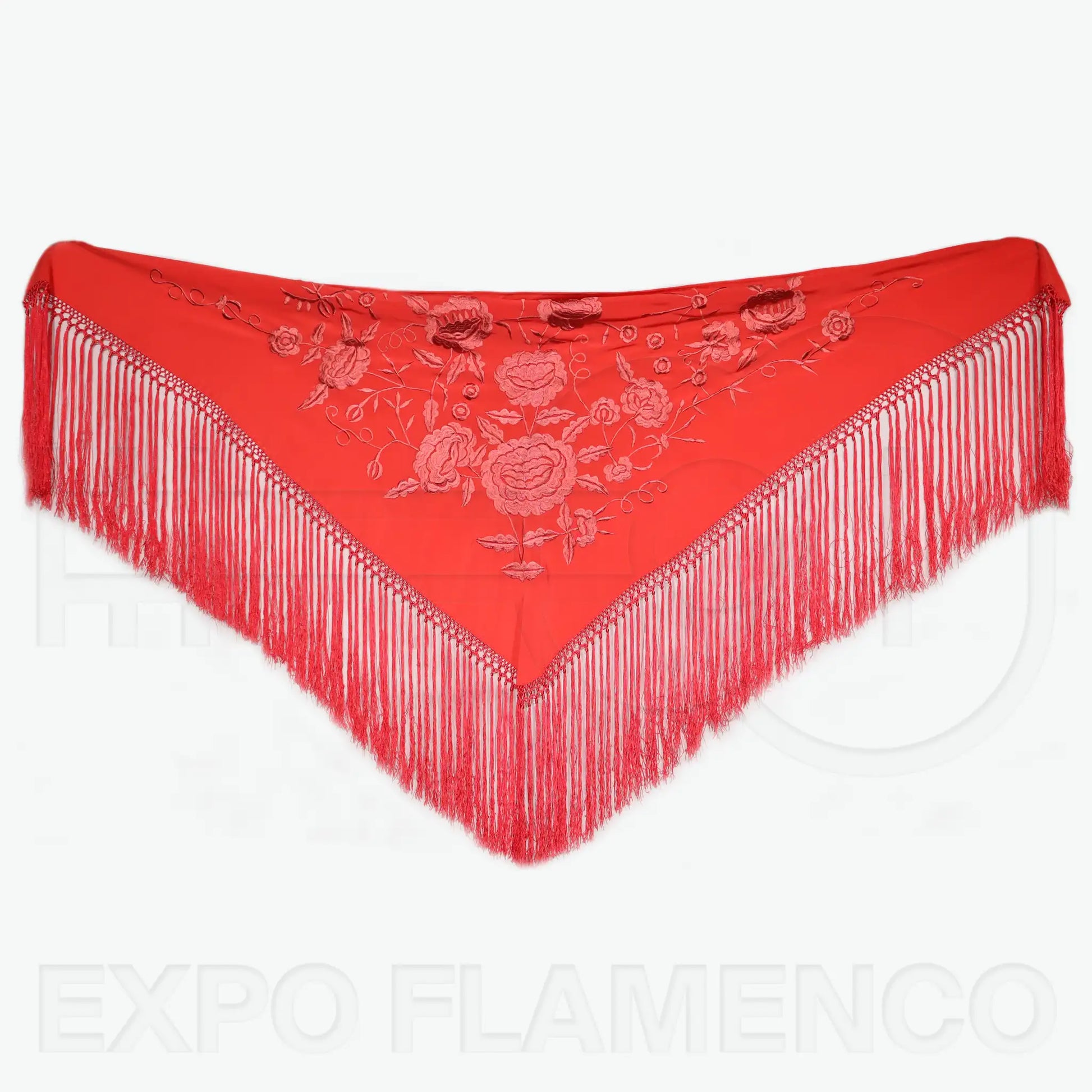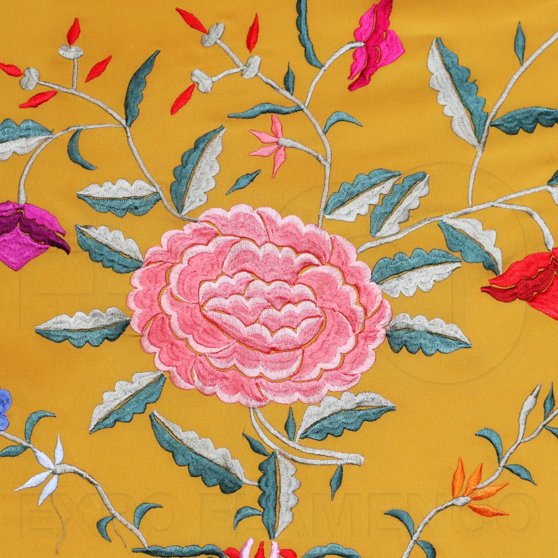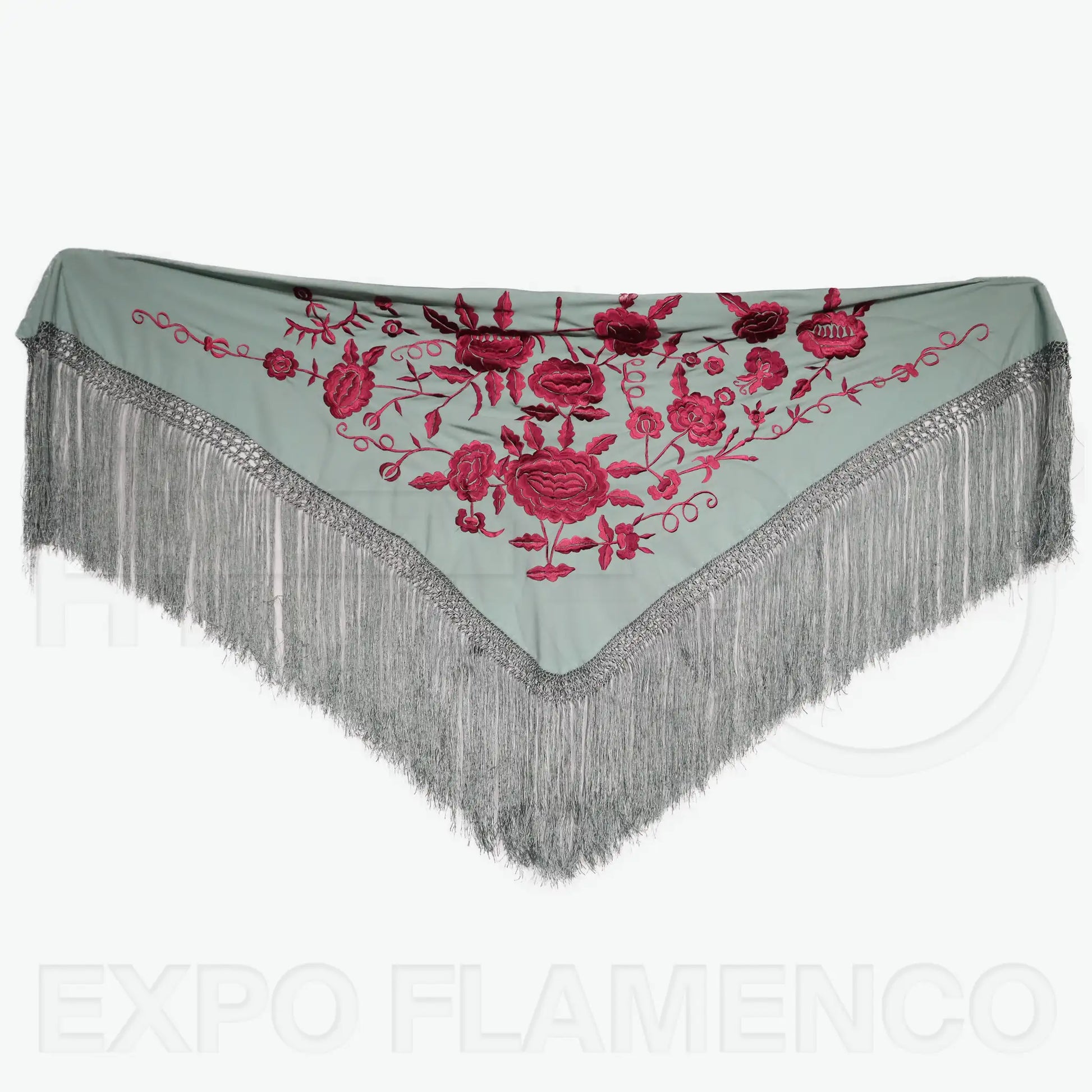 Este mantoncillo de crespón de seda en varios colores, con un aristocrático bordado en seda, es una prenda de artesanía española creada a mano con maestría. Un enrejado con minuciosidad manual preside esta obra de arte, cuyas medidas son: 130 cm de largo, 64 cm de ancho máximo y 26 cm de enrejado más fleco.