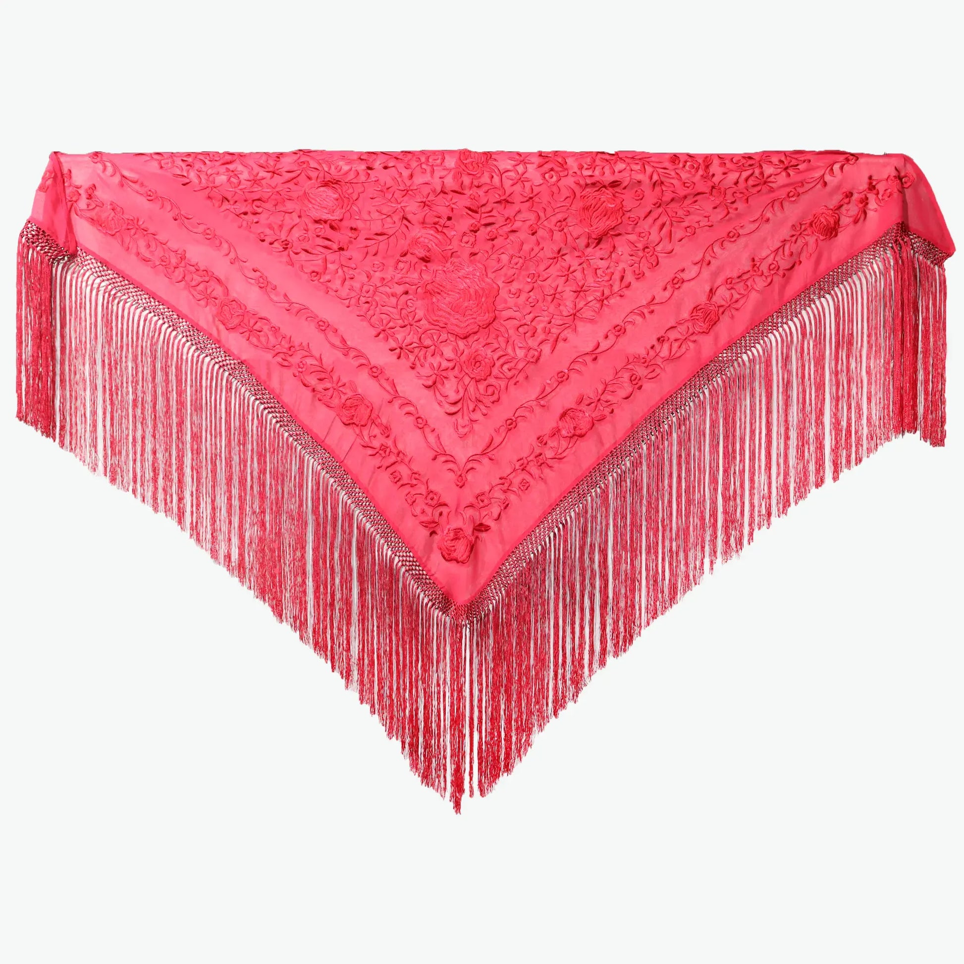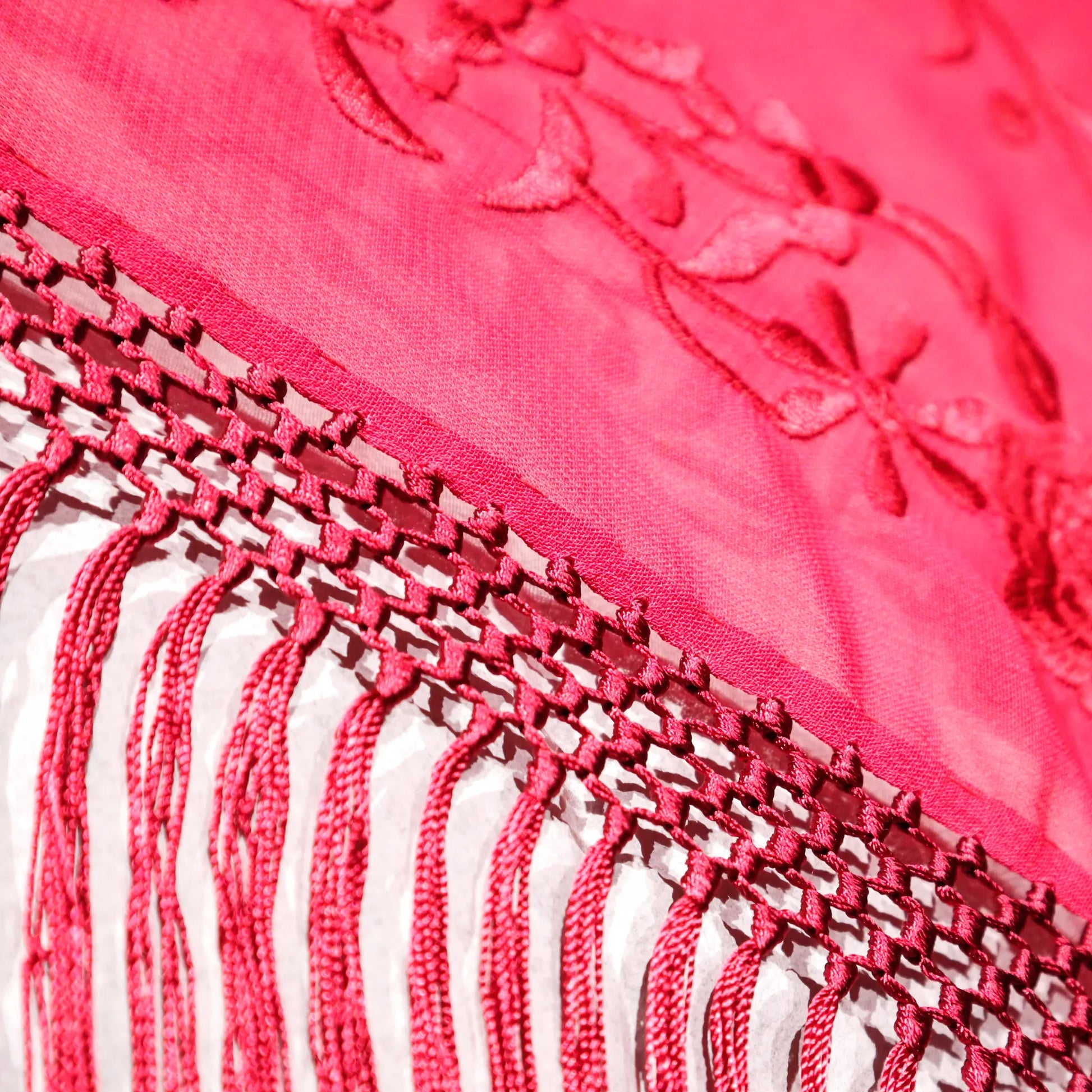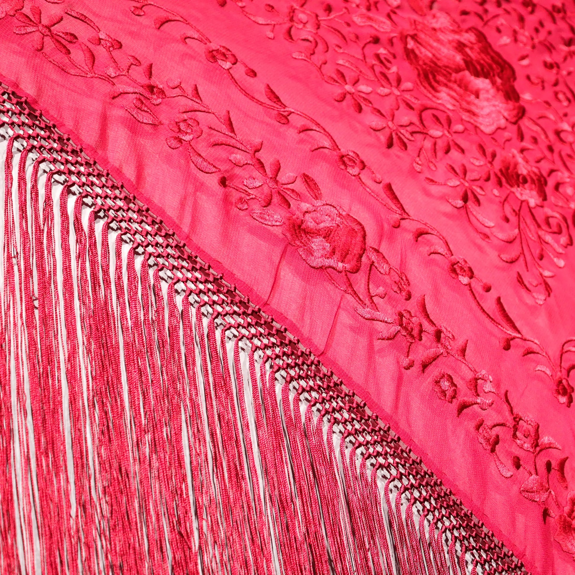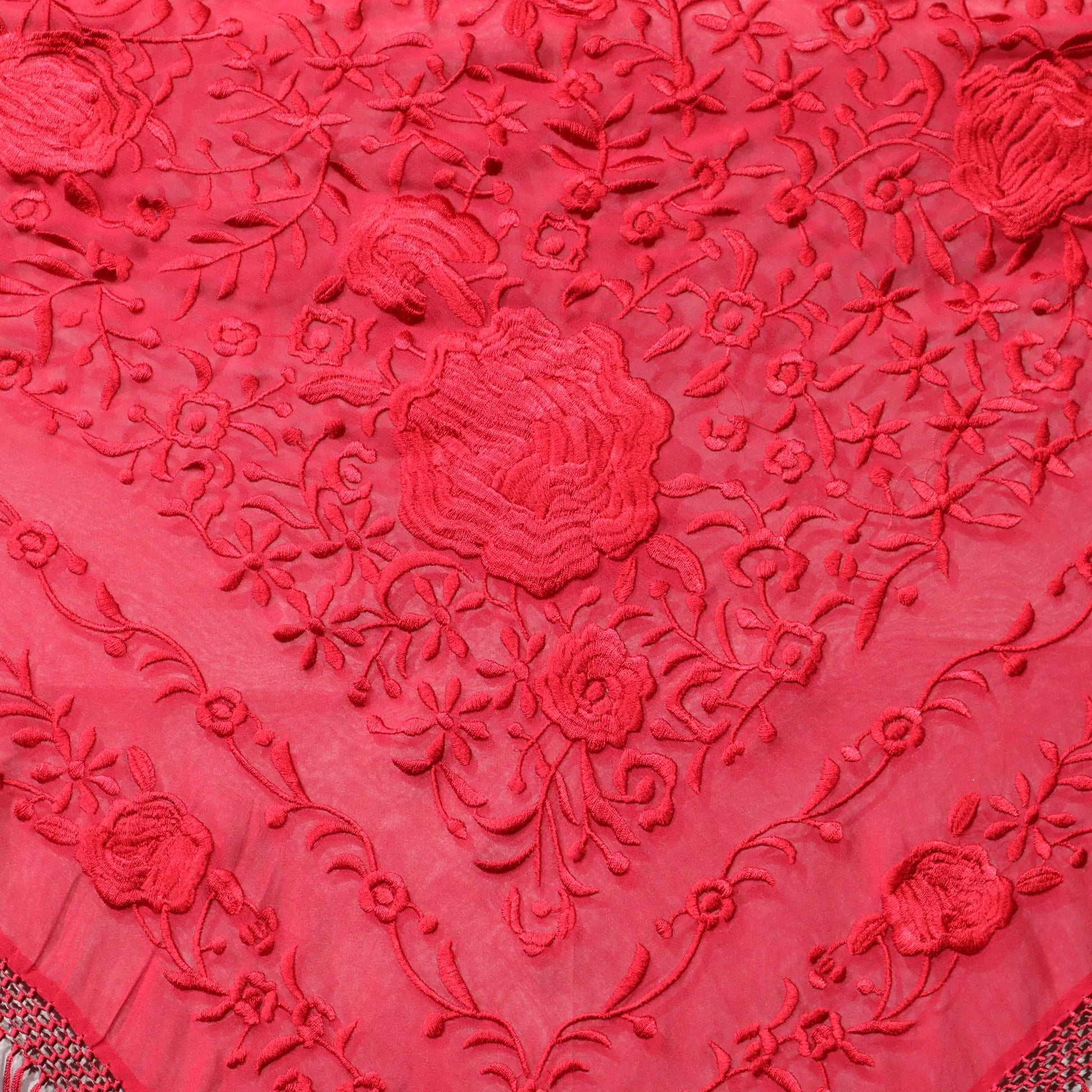 Mantoncillo en gasa roja, bordado en seda. Enrejado hecho a mano, artesanía española.