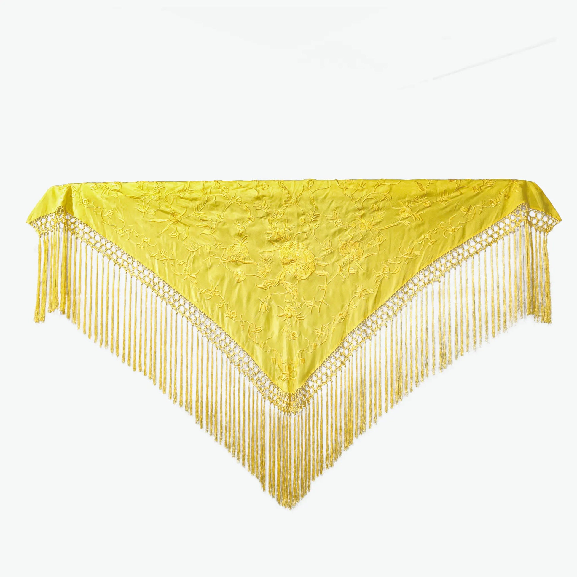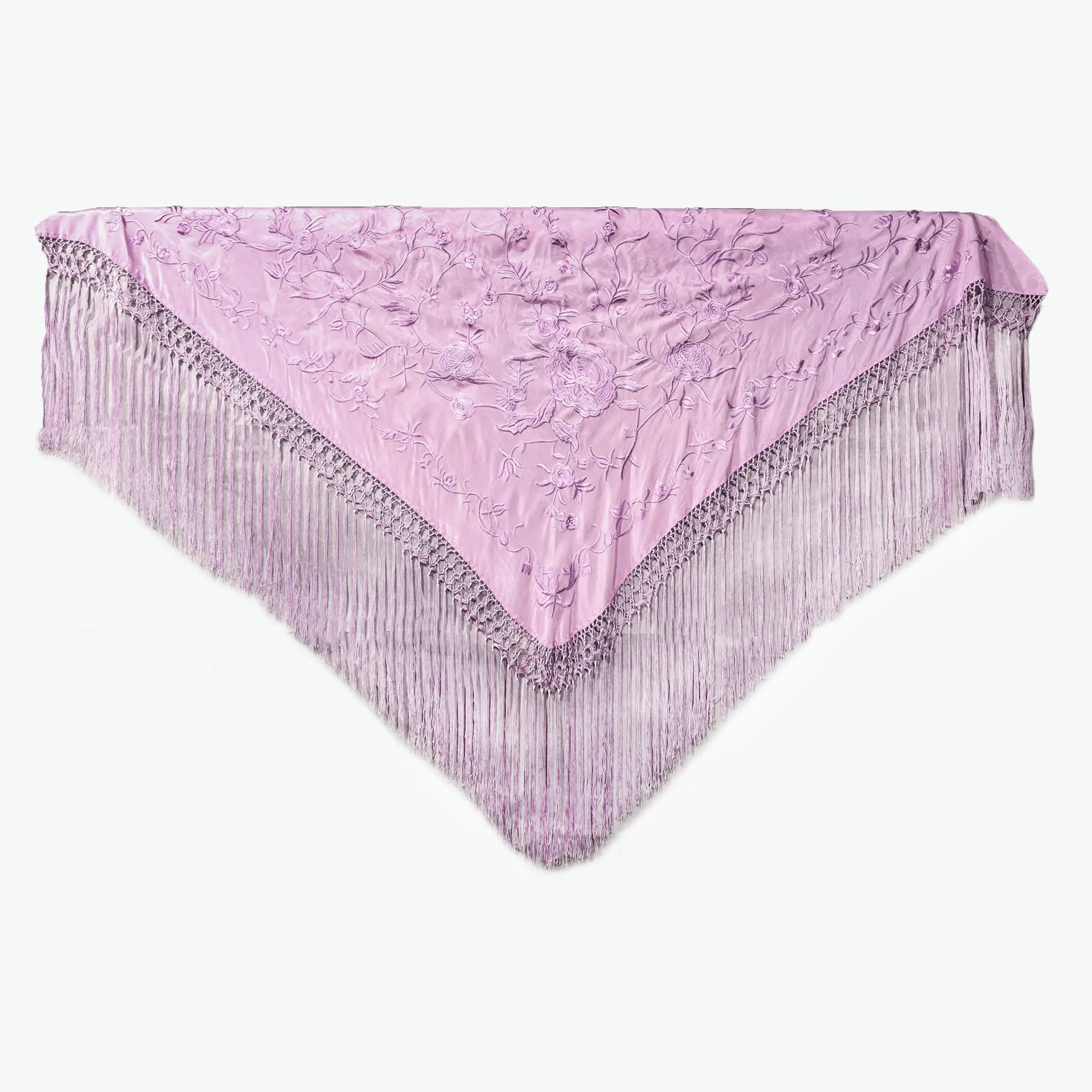 Elegante mantoncillo de crespón en una variedad de colores, exquisitamente bordado en seda. Su preciado diseño enrejado es hecho a mano usando la tradición artesana española. Medidas aprox.: Largo 130 cm, Ancho máx. 64 cm, Enrejado & Fleco 26 cm. 122 cm x 65 cm.