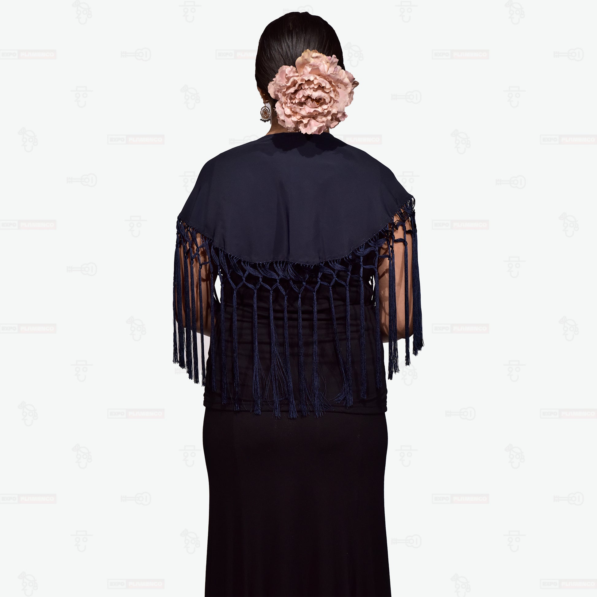 El borde del mantoncillo está decorado con encaje fino y detalles intrincados, lo que subraya la maestría artesanal y el diseño refinado. Su forma ligeramente rectangular permite que caiga de manera grácil sobre los hombros, complementando de forma ideal cualquier traje de flamenca con su estética clásica y su acabado impecable.