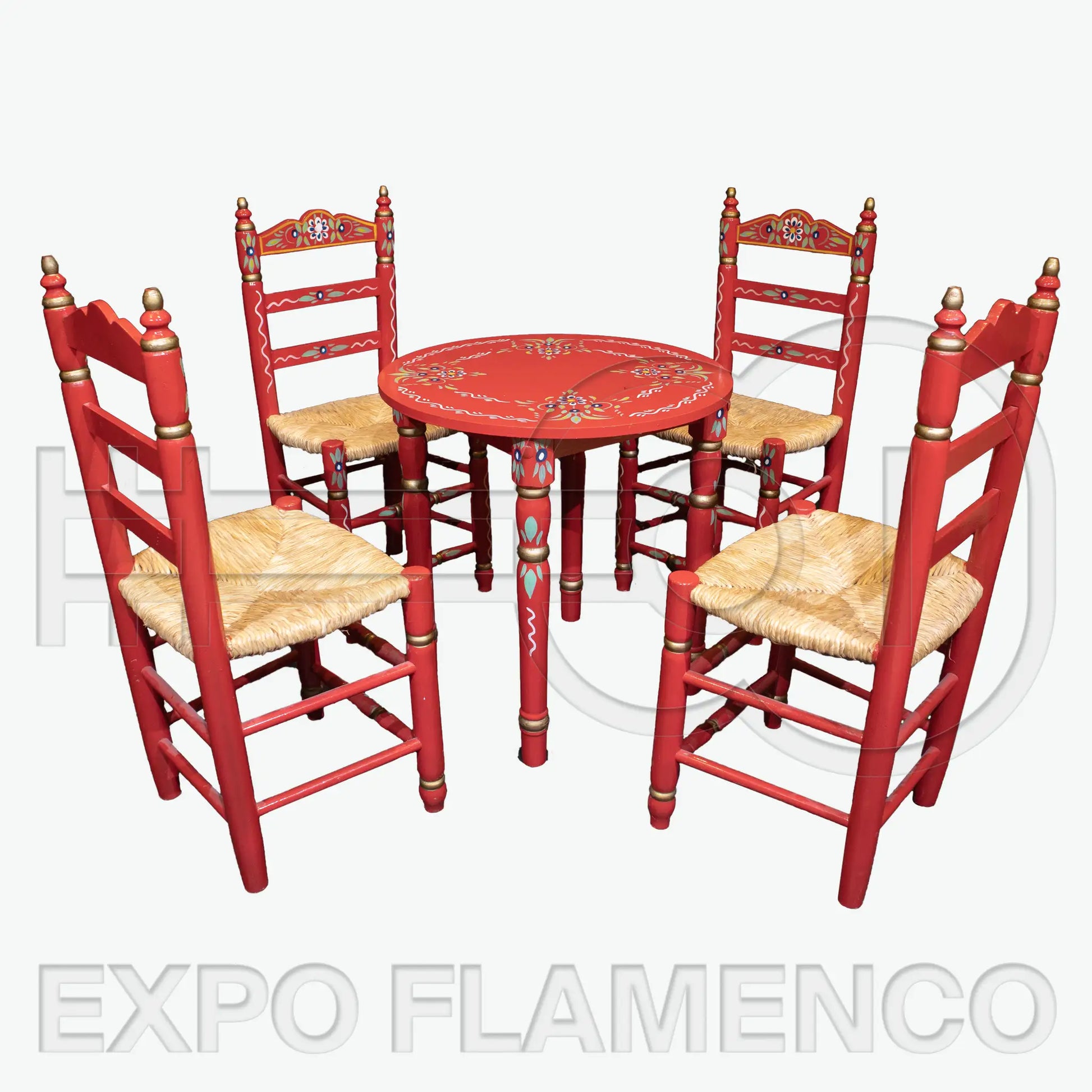 Paquete de 1 mesa de 60cm de diámetro+ 4 sillas de enea sevillanas de color rojo, tiempo de fabricación aproximado 15 dias.