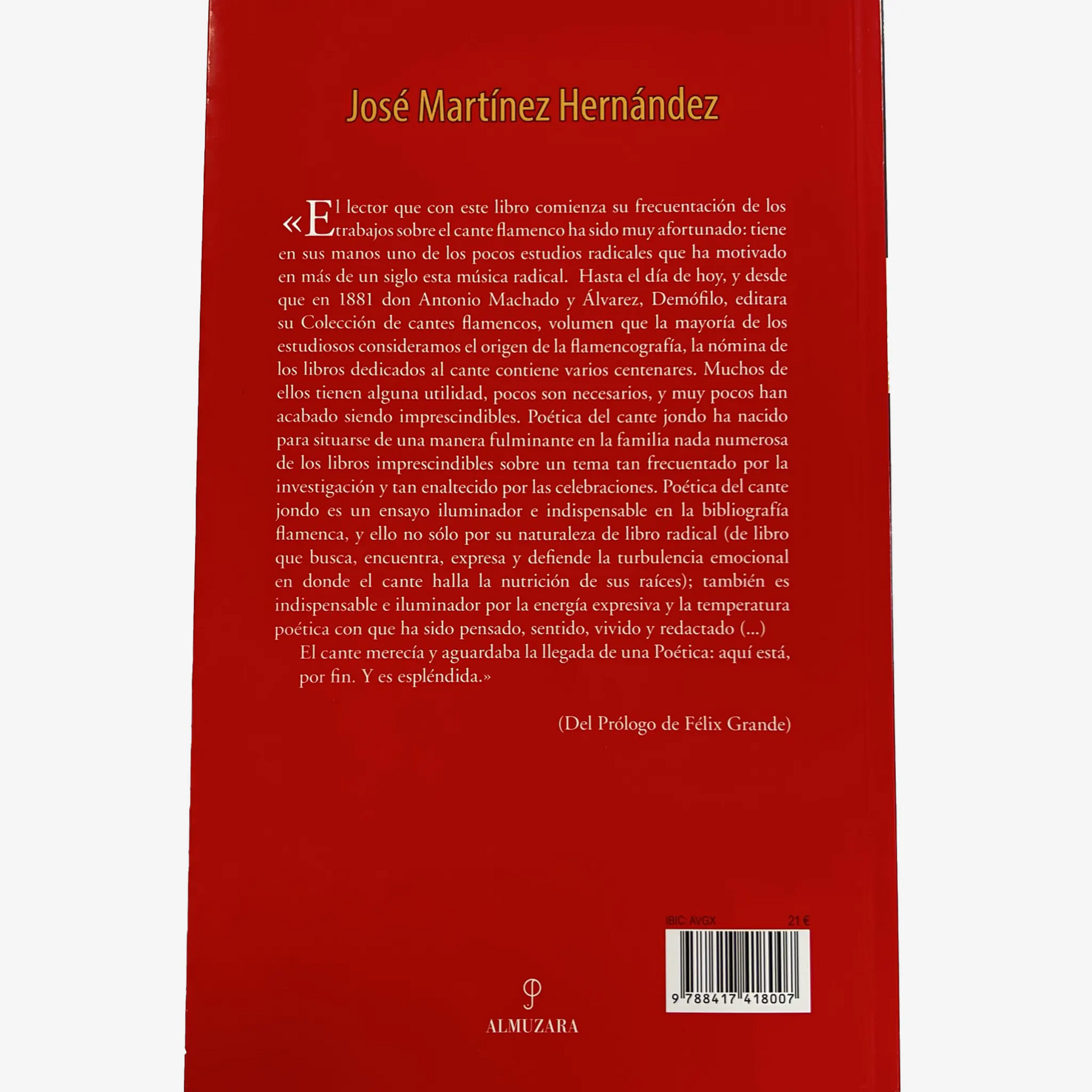 Poética del cante jondo es un libro que ha nacido para situarse en la familia de libros imprescindibles sobre un tema tan frecuentado por la investigación. Es un ensayo que busca, encuentra, expresa y defiende la turbulencia emocional en donde el cante halla la nutrición de sus raíces. El subtítulo "Filosofía y poética" encuentra su razón en este maravilloso párrafo: "Elaborar una filosofía y poética del duende es la prueba de fuego de cualquier estética del flamenco, porque detrás de esa humilde palabra se halla toda una concepción del arte y de la vida, una filosofía de la creación artística (...) una visión peculiar y original del mundo".