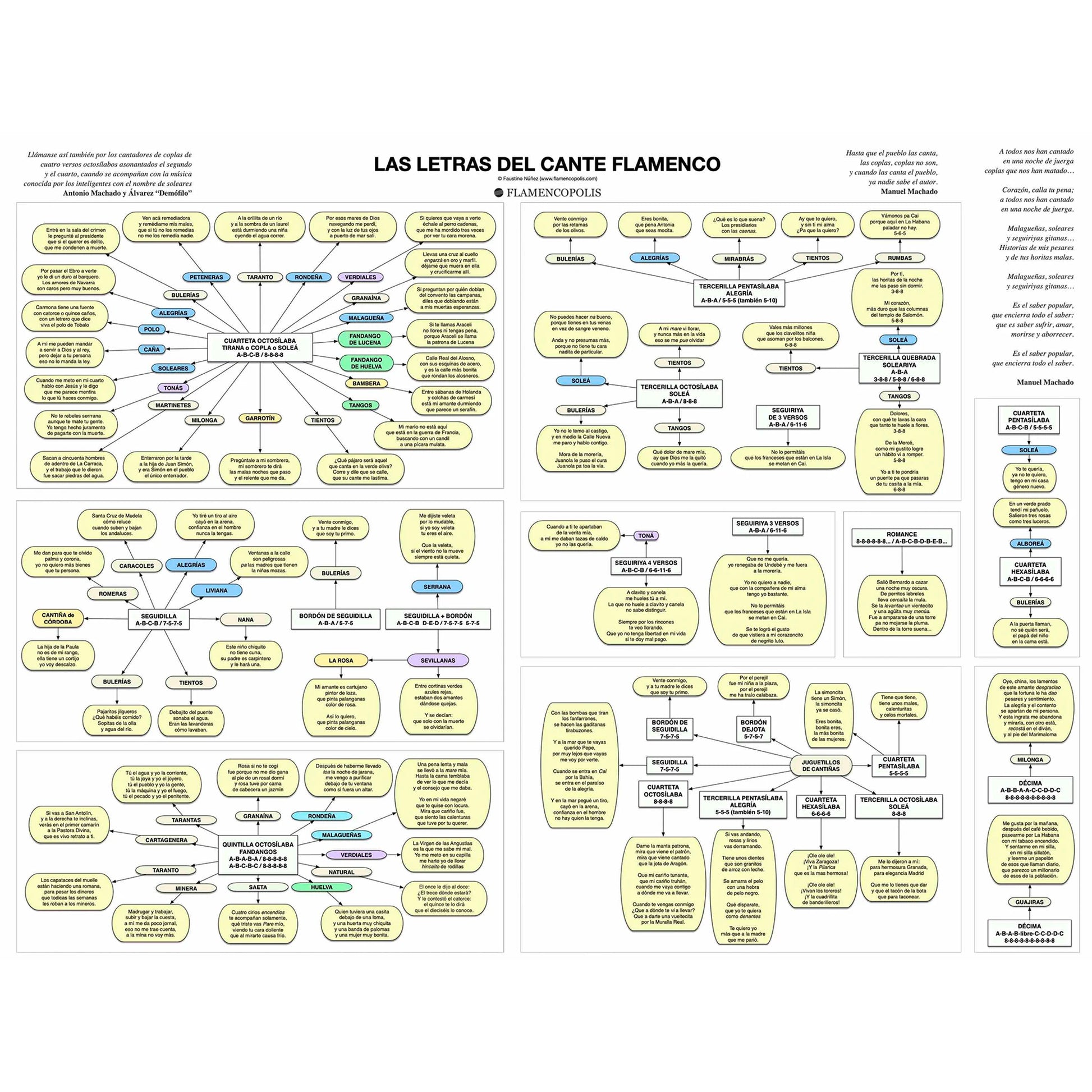 En el póster realizado por el musicólogo Faustino Núñez dedicado a las letras del cante flamenco vemos de forma esquemática todas y cada una de las estrofas sobre las que los flamencos interpretan sus cantes. Una lámina que muestra la métrica, la rima y un ejemplo del estilo en el que se utiliza la letra correspondiente. La medida del póster es de un metro de ancho por setenta de ancho (100x70 cm).