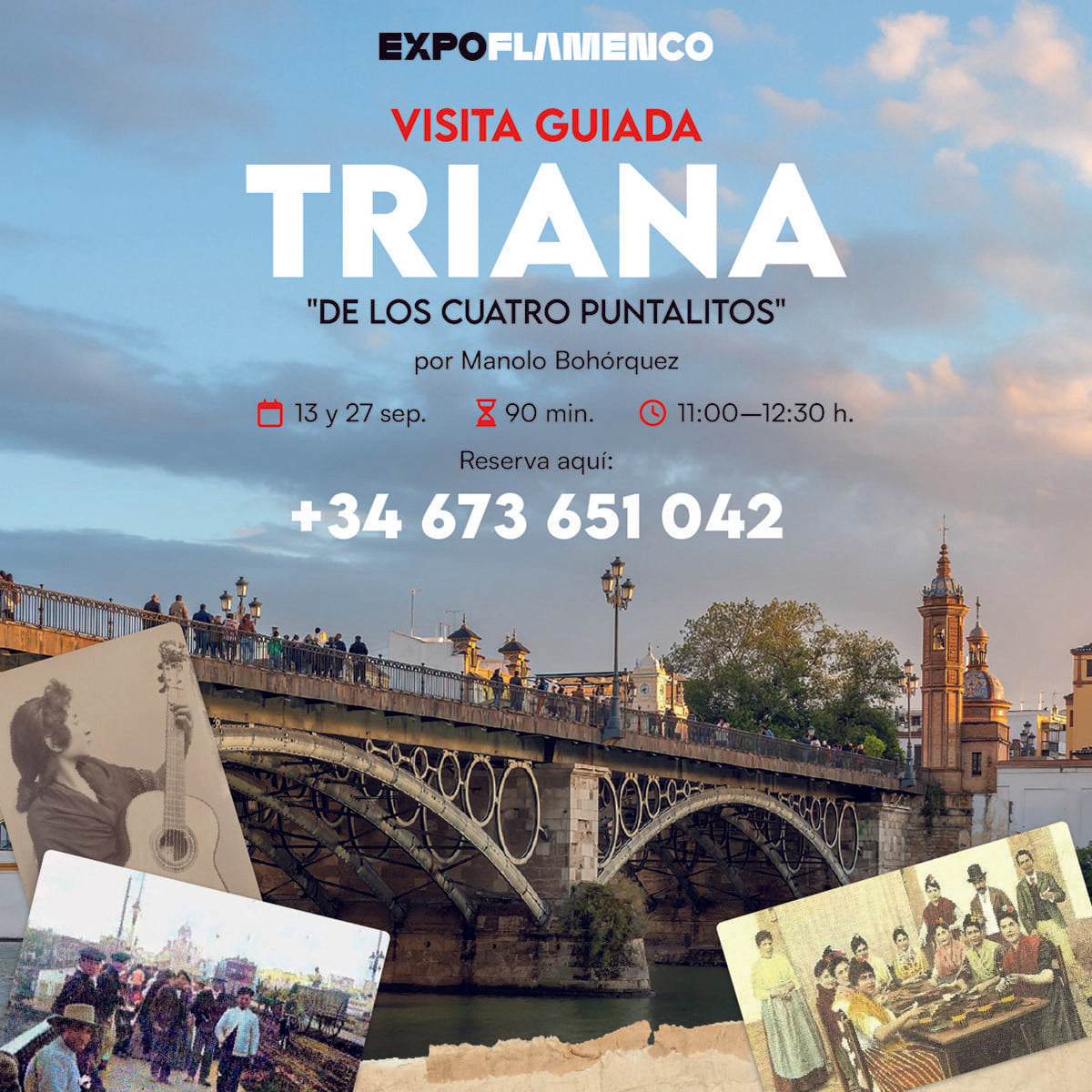 Triana es una de las cunas del flamenco, sobre todo del cante. Arrabal sevillano, cuando cruzas el puente entras en una especie de túnel del tiempo que te lleva a un barrio pobre, de herreros, alfareros y agricultores, con antorchas n las calles, corrales de vecinos y fraguas. Triana ya no tiene nada que ver aquel arrabal del XVIII, cuando comenzó a florecer el flamenco, pero una investigación nos ha permitido poder hacer un retrato fiel de aquel paraíso del arte jondo. En la visita guiada a Triana conoceremos dónde nacieron y vivieron familias gitanas como las de los Puyas, Caganchos, Pelaos y Fillos. Visitaremos sus corrales, hoy ya restaurados y llenos de extranjeros, y sus tabernas y locales más célebres. Hora y media de paseo, una conferencia en la calle, un viaje en el tiempo por calles como San Jacinto, Betis, Pureza, Pages del Corro, Evangelista, Troya, Castilla, Procurador, Febo… Incluye visita a la Escuela de Cristina Heeren.