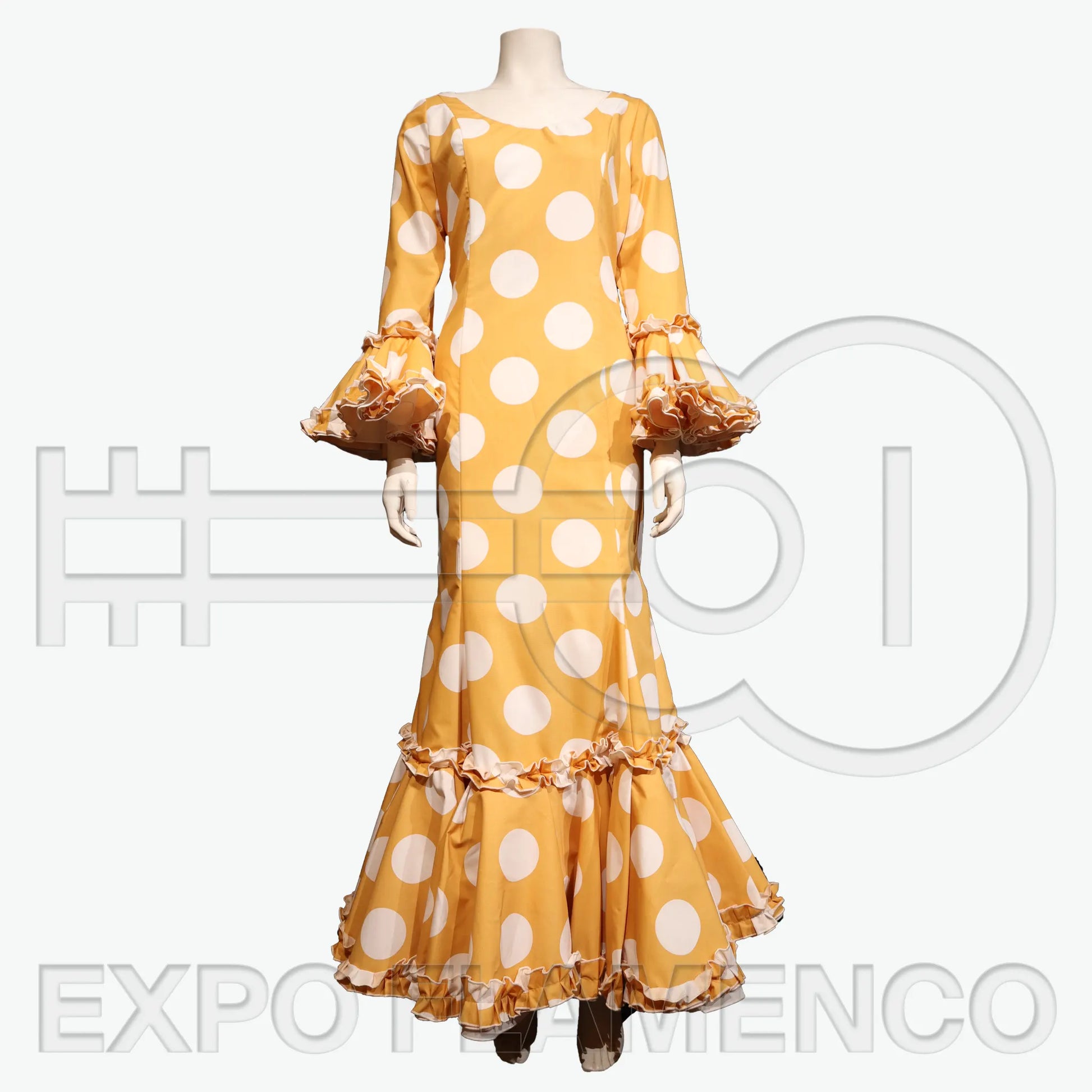 El Traje de Flamenca Guadalquivir es extraordinario. Está confeccionado en un tono amarillo-ocre luminoso con grandes lunares blancos.