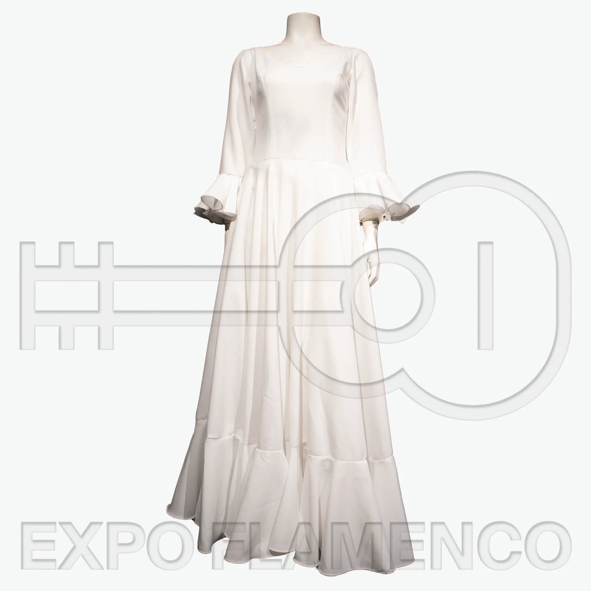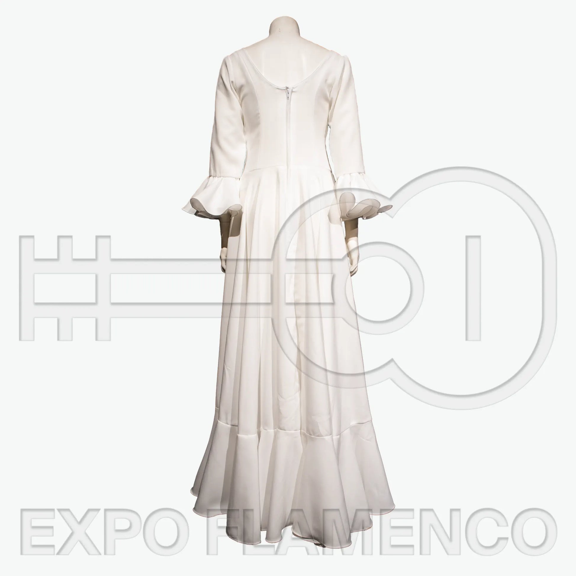 Traje de flamenca en elastina blanco, adecuado para el baile y las romerías. De gran vuelo desde la cintura en un gran volante de una pieza cortado en una capa. Se refuerza con un añadido a forma de volante. El resultado es magnífico. Se puede conjugar con cualquier color y forma de mantoncillo.