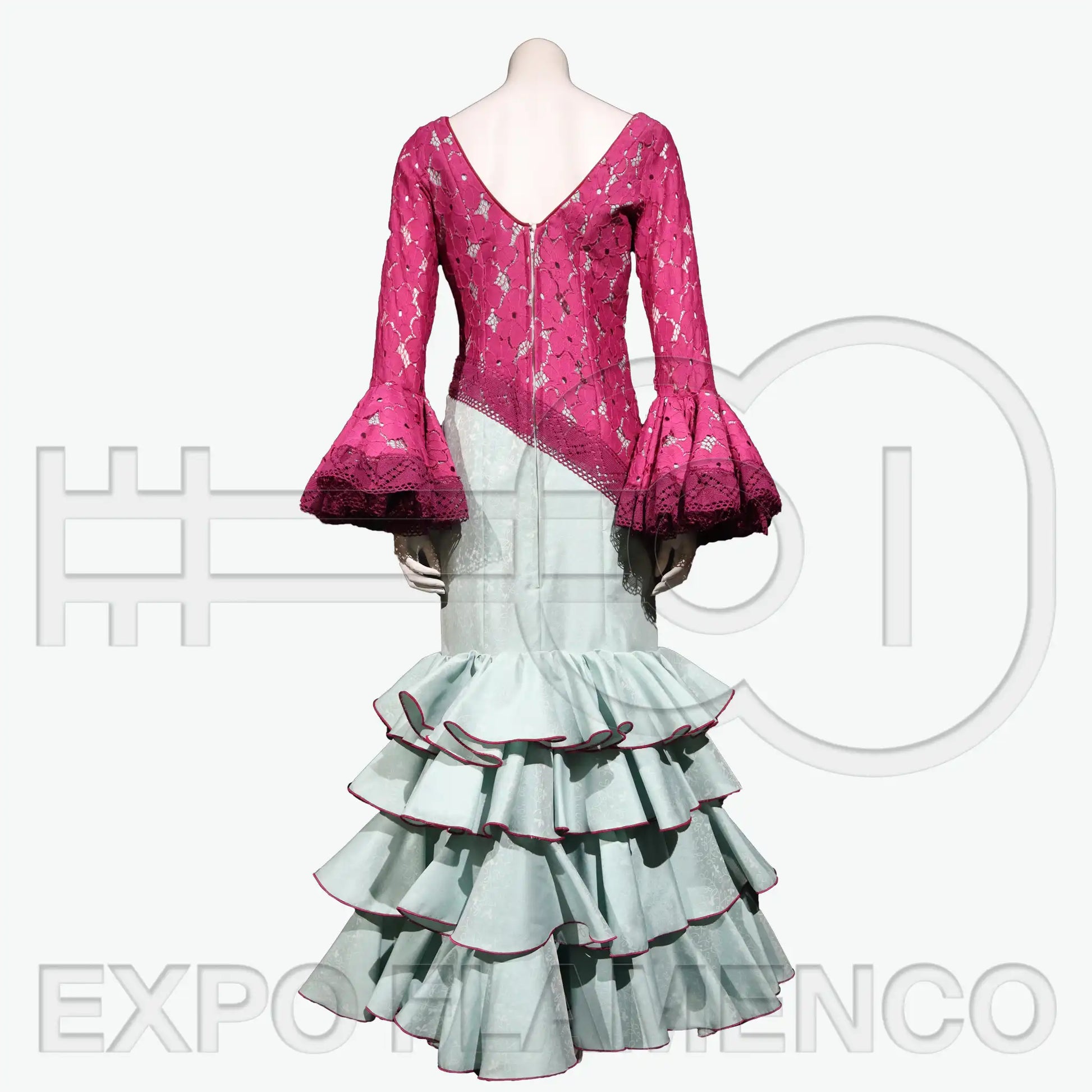 ¡Elige el Traje de Flamenca Yoana para tu próxima fiesta! Este diseño único y moderno es perfecto para lucir elegante. El cuerpo de encaje color buganvilla con corte inclinado hacia la cadera contrasta con la vistosa falda en color agua marina clara. ¡Atrévete a brillar con clase!