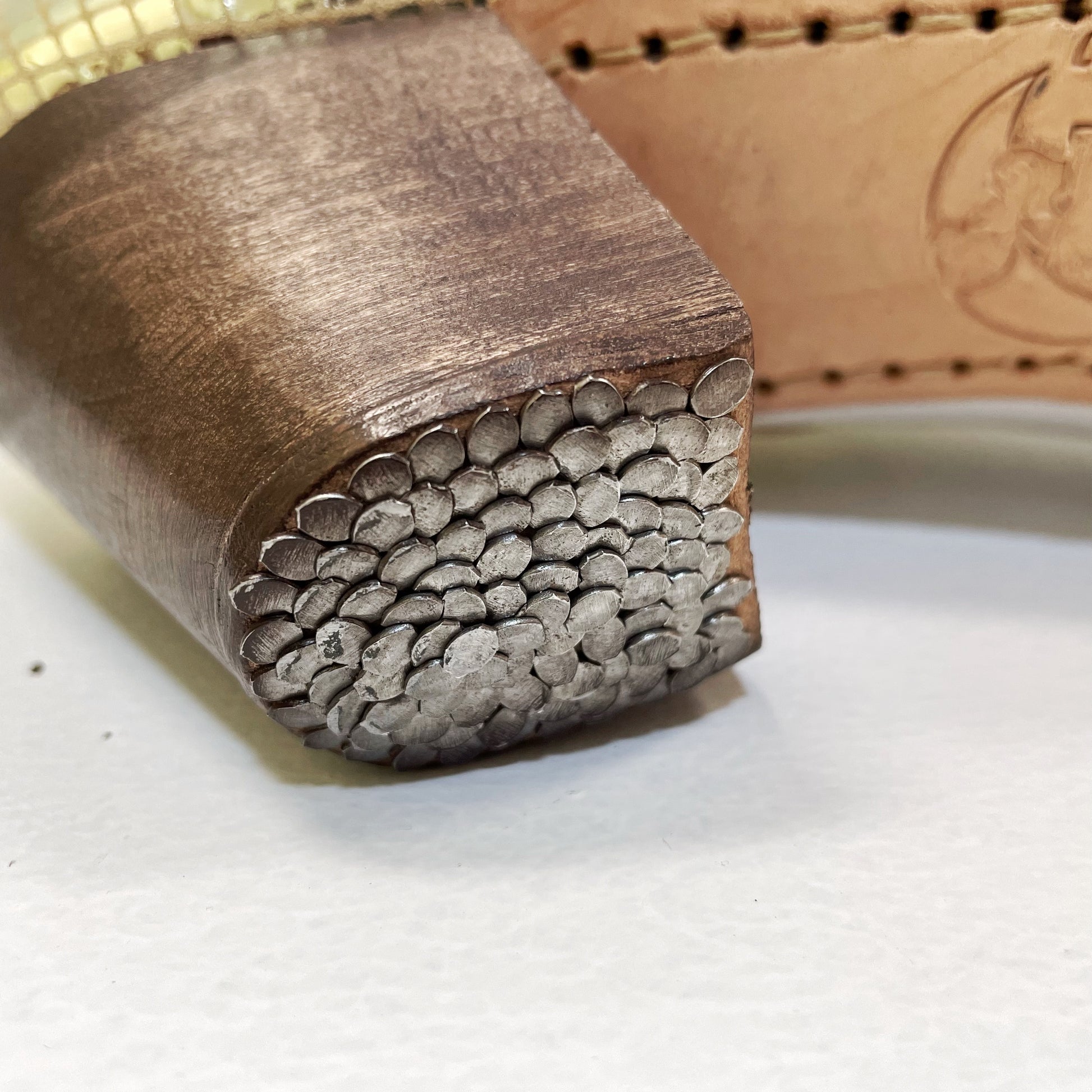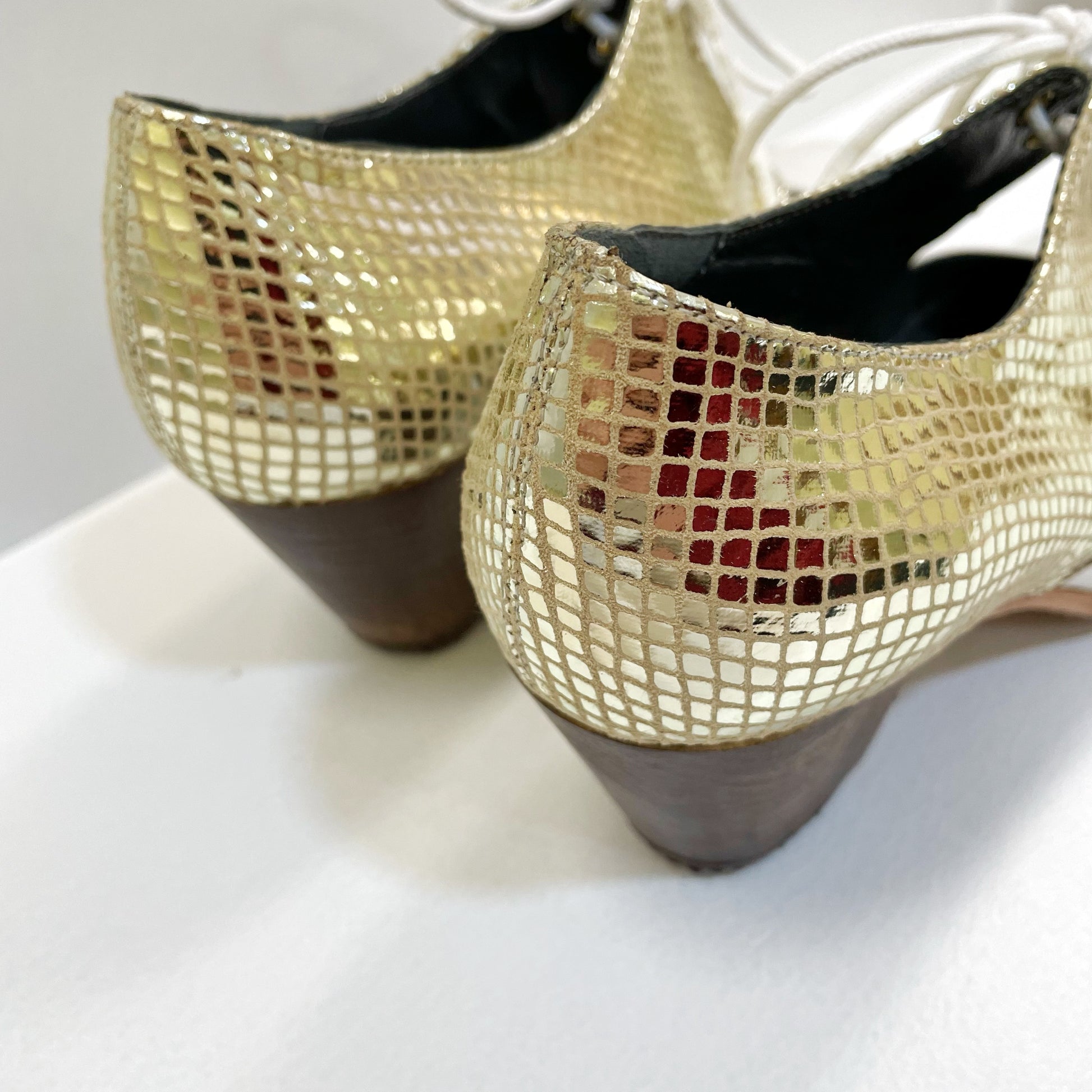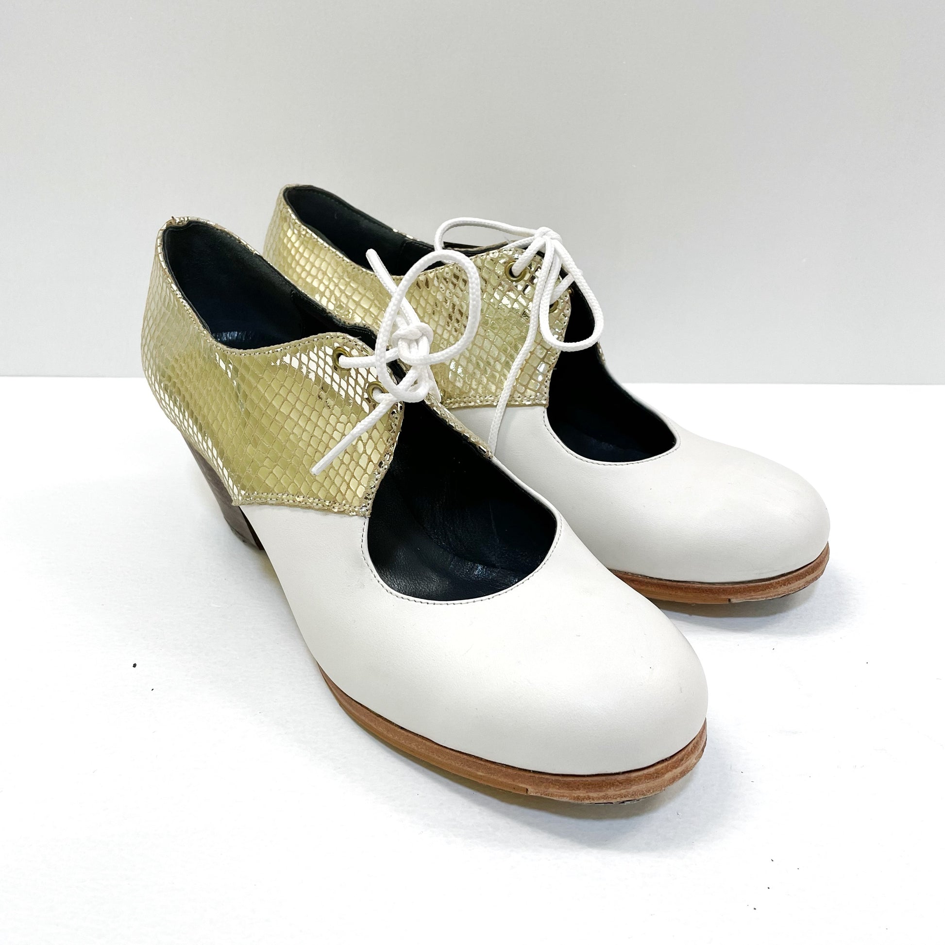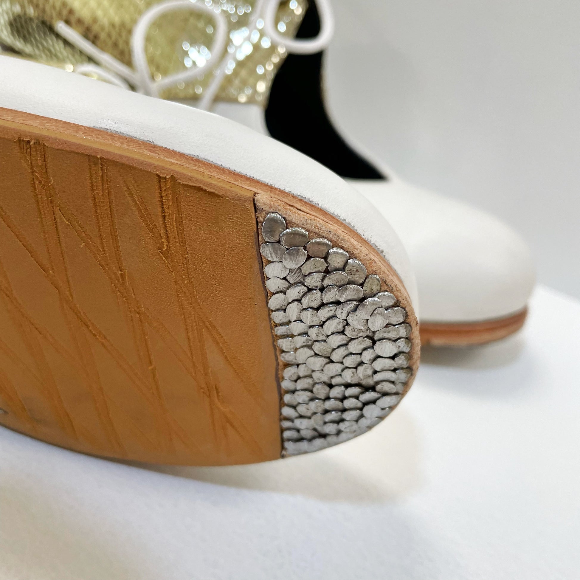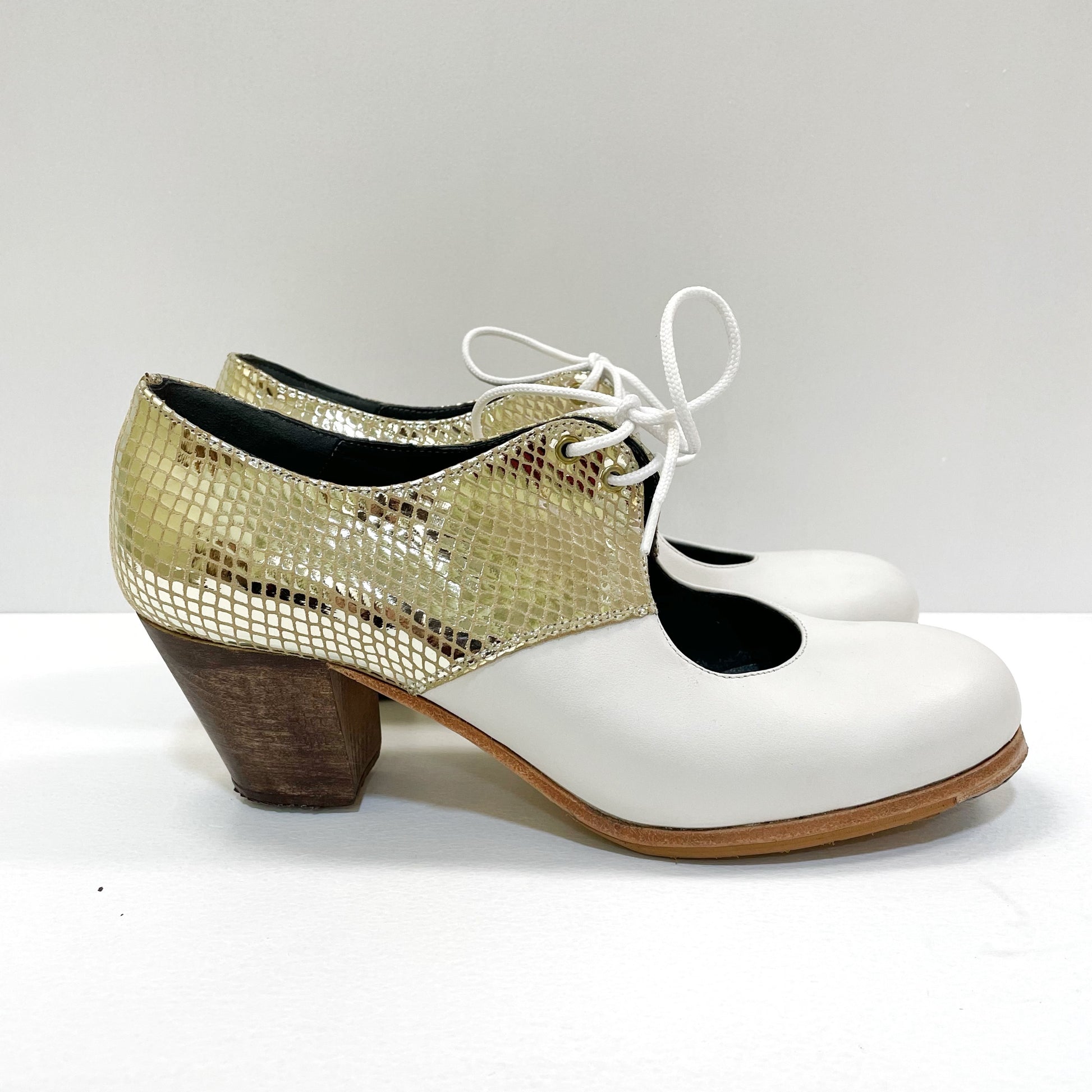 Zapatos de baile profesional personalizado por ExpoFlamenco. Modelo lazo partido blanco piel y serpiente dorada.