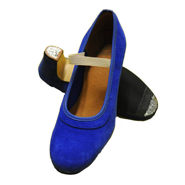 Zapato de baile flamenco semi-profesional en varios colores. Muy adecuado para principiantes. Con tira elástica en el empeine. Realizado en ante afelpado, suela de goma y semi-forrado, con clavos en puntera y tacón.
